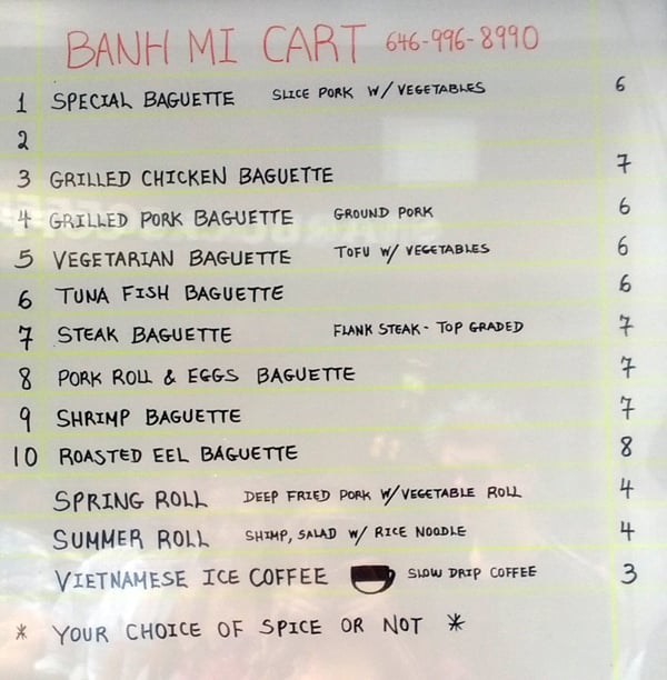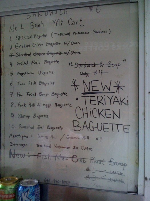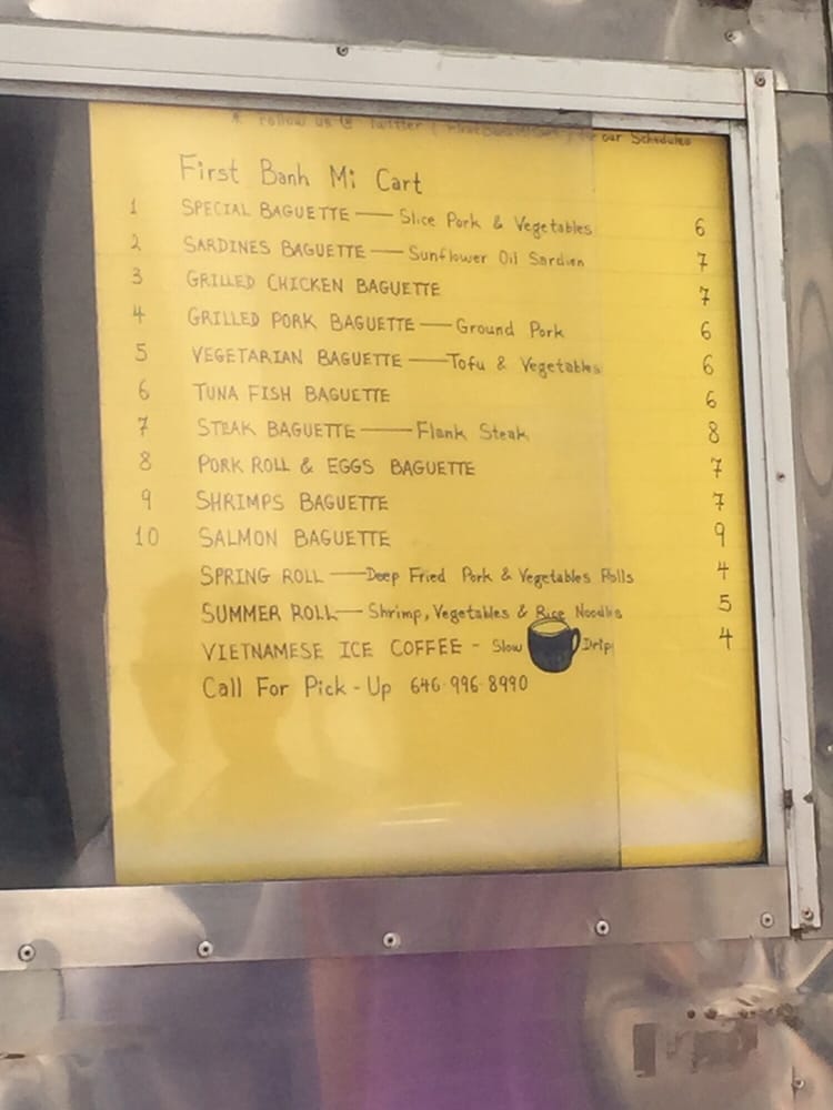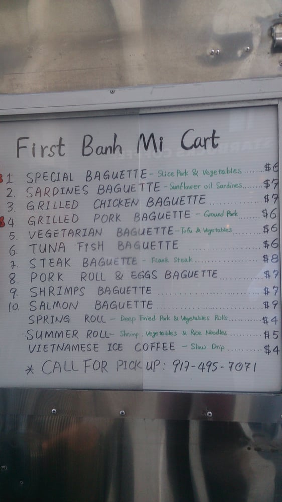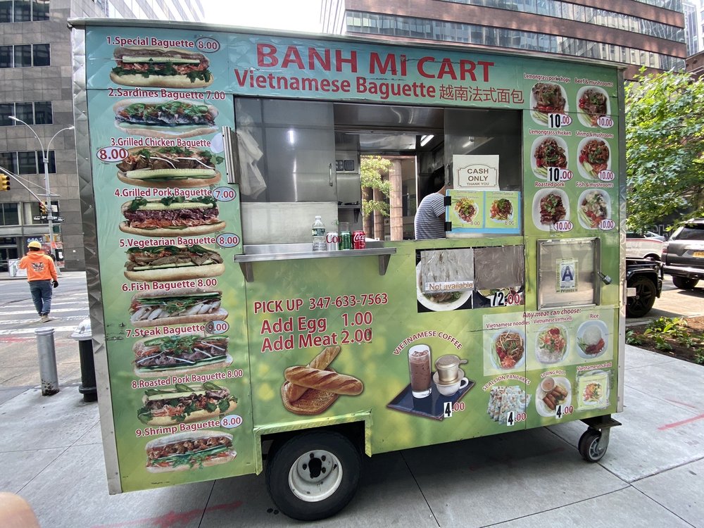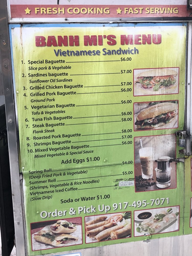 Introducing the menu at Banh Mi Cart, a Vietnamese food truck located in New York. With a focus on Banh Mi sandwiches, customers rave about the fresh ingredients and flavorful options. The cart also offers rice and noodle dishes, as well as pho and pork chop over vermicelli. Reviewers highlight the efficient service, affordable prices, and generous portions. The grilled pork Banh Mi and beef pho stand out as must-try items. Despite some minor criticisms about bread size and meat quality, overall, Banh Mi Cart is praised for its quick, tasty street food options. Perfect for a casual lunch or quick bite in the Financial District, this food truck is a hidden gem for authentic Vietnamese cuisine.